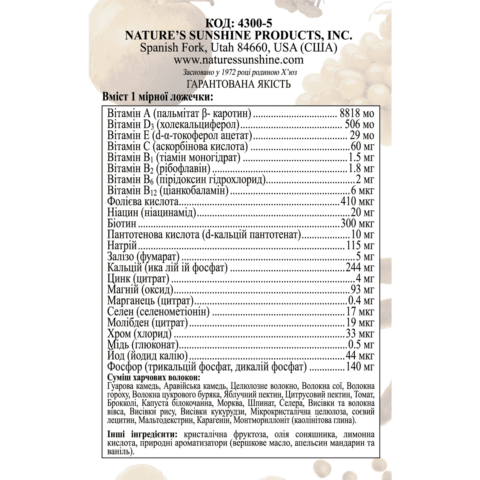 Кристаллическая фруктоза, аравийская камедь, соевое волокно, подсолнечное масло с высоким содержанием олеиновой кислоты, зерновой сироп, натуральные ароматизаторы, мальтодекстрин, овсяное волокно, фосфат кальция, лимонная кислота, фосфат калия, бета-каротин, казеинат натрия, пищевые волокна из различных растительных источников, оксид магния, моно и диглицериды, гуаровая камедь, хлорид натрия, цитрат калия, хлорид калия, витамин С (аскорбиновая кислота), ниацин, цитрусовый пектин, d-альфа токоферол ацетат (витамин Е), биотин, витамин А, соевый лецитин, фумарат железа, d- кальций пантотенат (пантотеновая кислота), концентраты томата, броколли, капусты, моркови, шпината, сельдерея, витамин В6, витамин В12, витамин В2, оксид цинка, витамин В1, витамин Д3, фолиевая кислота, глюконат меди, цитрат молибдена, селенометионин, цитрат марганца, хлорид хрома, йодид калия.Применение: