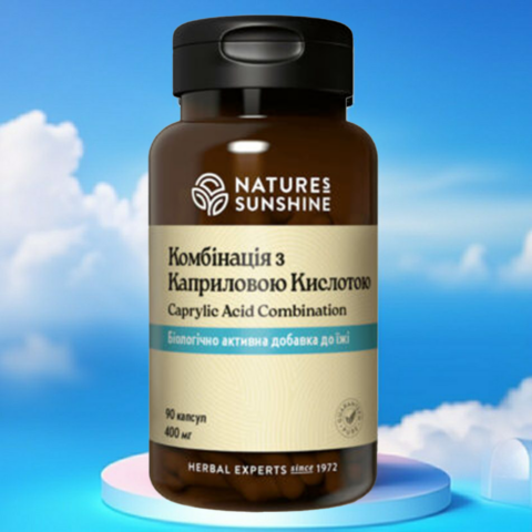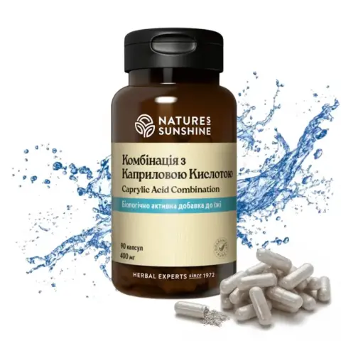 Combinația de acid caprilic conține acid gras cu lanț mediu (acid caprilic). Acesta se găsește în mod natural în uleiul de palmier și de nucă de cocos. Acest acid reglează creșterea ciupercilor Candida, menținând nivelurile normale de microorganisme în colon. Însăși reproducerea bacteriilor, care sunt necesare pentru sănătate, se desfășoară în mod obișnuit.