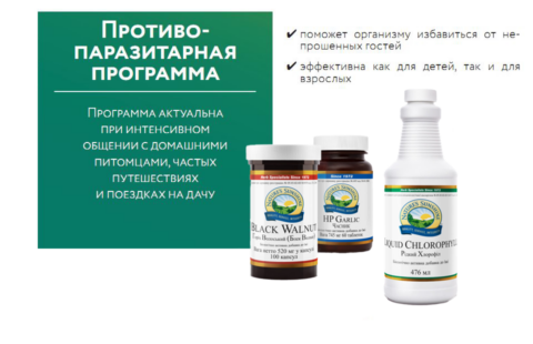NSP introduce un nou kit pentru prevenirea și controlul eficient al paraziților. "Antiparazitar". trusa se bazează exclusiv pe ingrediente naturale, al căror spectru de acțiune este mult mai larg decât cel al substanțelor sintetice. Cursul de administrare al produselor naturale este mai lung, dar datorită absenței efectelor toxice, este cel mai potrivit pentru tratamentul și prevenirea pentru toate grupele de vârstă, de la copii mici la vârstnici. Trei produse de top din gama NSP: nuca neagră, usturoiul și clorofila lichidă rezistă oaspeților nepoftiți. Nuc negru. Nu degeaba ciupercile nu cresc sub nuci, iar insectele nu pizmuiesc în mod deosebit planta. Substanțele conținute în frunzele copacului au o gamă largă de efecte asupra tuturor tipurilor de helminți: viermi plați, sugaci, giardia, paraziți pluricelulare și viermi rotunzi. Efect distructiv al nucului negru are și asupra ciupercilor, inhibându-le vitalitatea. În plus, extractul din coajă are un efect de întărire asupra sistemului imunitar, îmbogățindu-l cu vitaminele C, PP, B1 și B6. Usturoi HP. Al doilea produs antiparazitar este usturoiul, atât de preferat de ucraineni în borș, pampushki și ca adaos la untură. Din cele mai vechi timpuri, această legumă mirositoare a salvat oamenii de infecții, scorbut și paraziți. Astăzi știm și mai multe despre ea și am ajuns să o apreciem pentru asistentul său eficient pentru sistemul cardiovascular. Spre deosebire de usturoiul proaspăt, care nu poate fi consumat în cantitate mare fără riscul apariției problemelor stomacale, produsul NSP, datorită capsulei de clorofilă, va fi digerat exclusiv în intestinul subțire, păstrându-și activitatea și neprovocând spasme și iritații la nivelul stomacului. Clorofilă lichidă. Clorofila lichidă este inclusă în kit pentru a neutraliza și elimina produsele paraziților și putregaiul din organism.