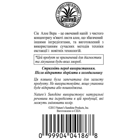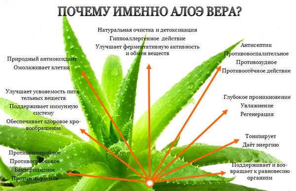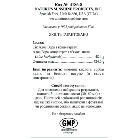 Compoziția suplimentelor alimentare Suc de Aloe Vera (AloeVeraJuice) păstrează toate proprietățile benefice ale acestei plante. Consumul medicamentului are un ușor efect de slăbire, care ajută la eliminarea toxinelor din organism. Conținutul în sucul de compuși de aloe antrachinonă ameliorează durerea și spasmele din intestine. Un efect antibacterian pronunțat apare datorită compusului antrachinonglicozid barbaloin. Medicamentul are un efect pozitiv vizibil în tratamentul gastritei cronice, constipației, ulcerului peptic și problemelor digestive. Aceasta ameliorează simptomele de iritare a mucoasei intestinului gros și îmbunătățește absorbția nutrienților.