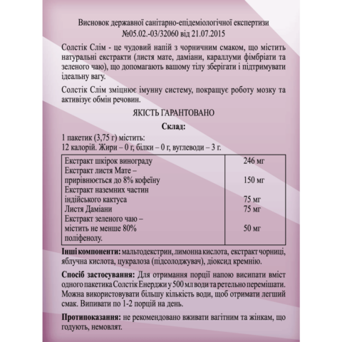 Мало того что комплекс компании NSP БАД Solstic Slim (Солстик Слим) невероятно полезный для организма, он еще и приятный на вкус. Благодаря черничному натуральному ароматизатору у продукта имеется приятный ягодный привкус. Вместо сахара использована его производная — сукралоза, которая не вызывает кариес и не имеет калорий. Сукролоза не вызывает аллергии, не токсична и абсолютно не имеет никаких побочных эффектов при частом длительном употреблении. Благодаря нашему комплексу вы не только потеряете все лишние ненавистные килограммы, но и приобретете уверенность в себе, энергию и силы.