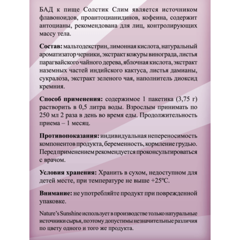 Похудение — нелегкий изнурительный процесс. Об этом известно всем, кто хоть раз пытался сбросить напоминающие о себе в зеркале килограммы. Изнурительные тренировки и голодание всё чаще заставляют отказаться от мечты и пустить все на самотек? Альтернативные методы часто бьют как по вашему бюджету, так и по здоровью? Поисковая система вашего компьютера устала от запросов — “как похудеть?”, “хочу похудеть”, “как похудеть легко и быстро?”? Компания NSP специально для вас разработала комплекс БАД Solstic Slim (Солстик Слим). Принимая этот чудесный препарат с ароматом черники, вы сможете контролировать вес, продолжая баловать себя любимыми блюдами. Работает комплекс как ловушка для калорий, обеспечивая вам безболезненное снижение веса.