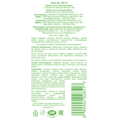 Sunshine Brite Green Tea — Зубная Паста с Экстрактом Зеленого Чая